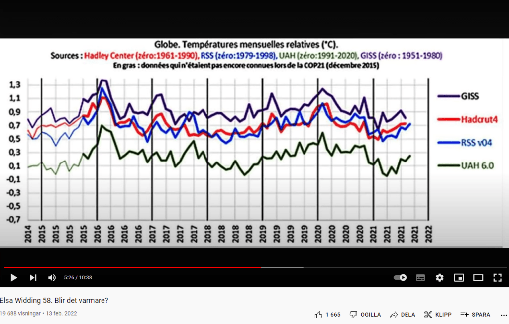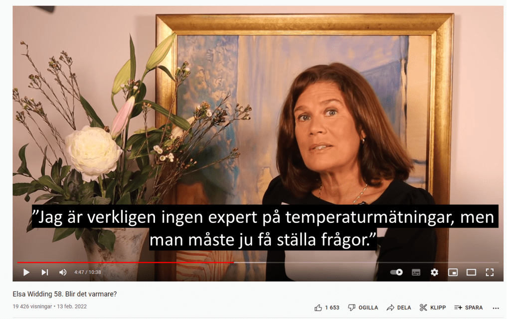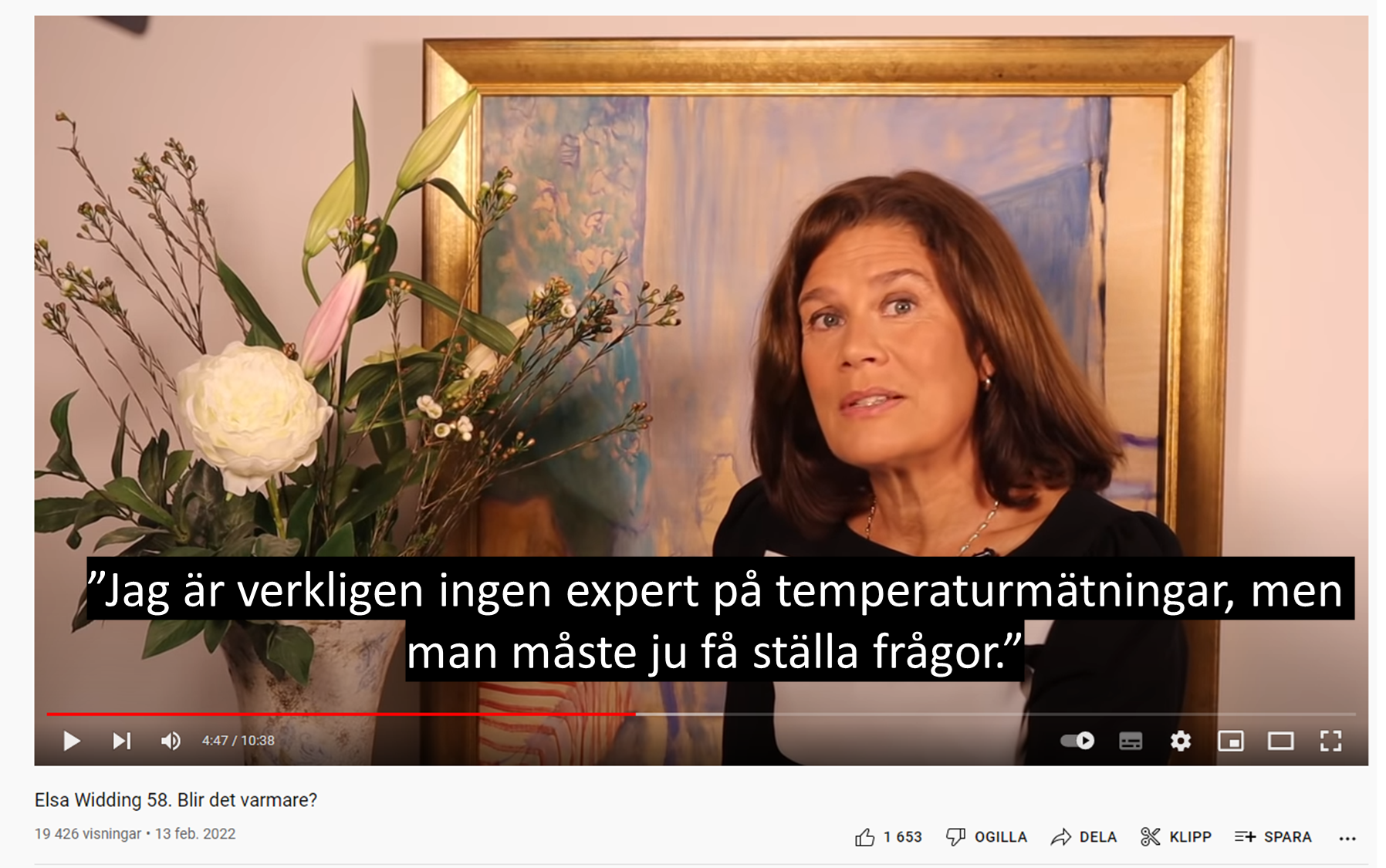 Men nu har hon ju blivit en toppolitiker i Sverigedemokraterna (12:a på deras riksdagslista) och hon representerar ju då förstås också deras deras officiella linje i frågan. Det ställer ju saken i ett annat läge. Och när hennes senaste video (nr 58) hade rubriken Blir det varmare? var jag bara tvungen att se om hon faktiskt ifrågasätter uppvärmningen.