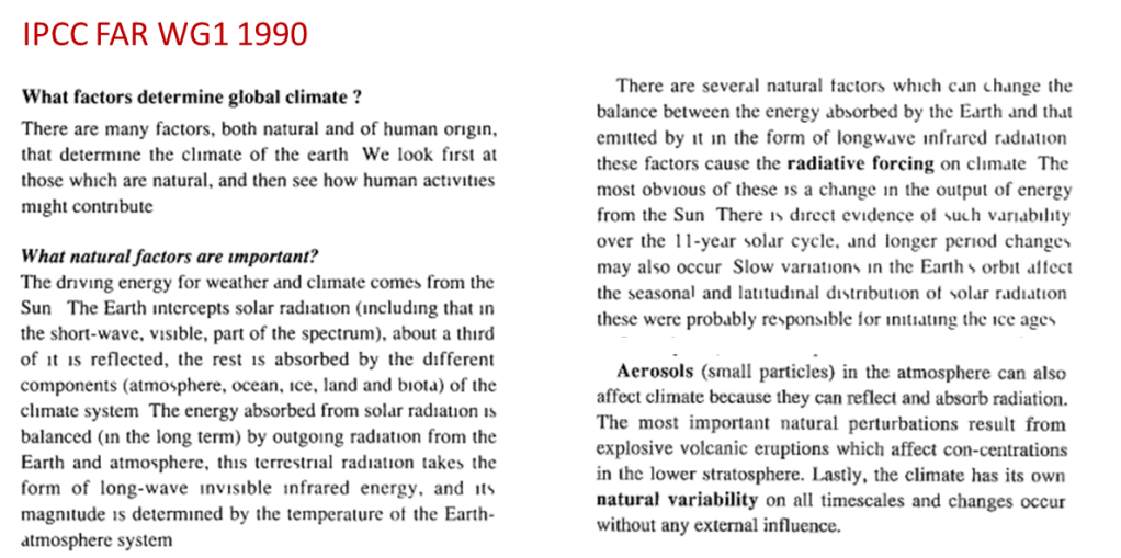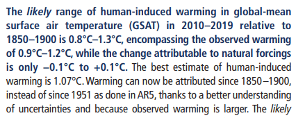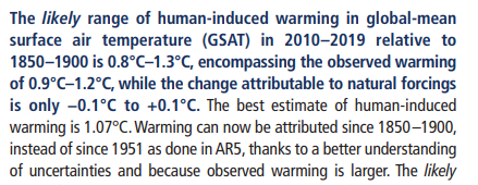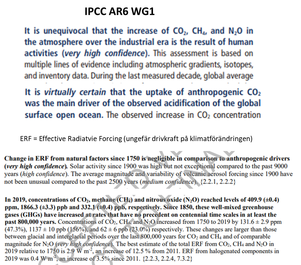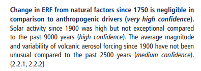 Först ett klargörande: Enligt IPCC är det alltså entydigt att den ökade halten koldioxid i atmosfären beror på våra utsläpp. De slår också fast, med mycket hög säkerhet, att uppvärmningen helt beror på mänskliga aktiviteter och att de ”naturliga drivkrafterna” är försumbara i jämförelse. Se utklipp nedan.