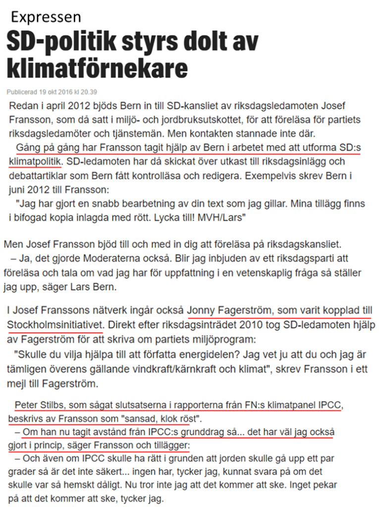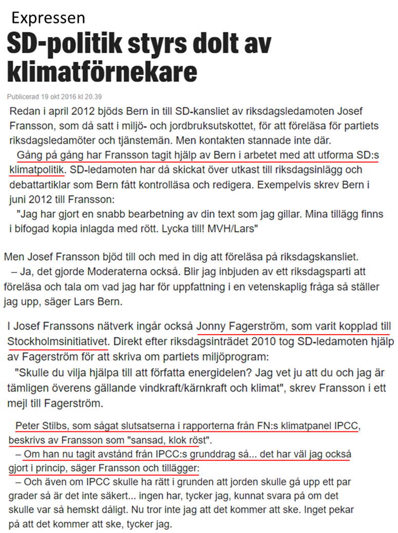 Vi kan väl börja med Josef Fransson = SD:s tidigare miljötalesperson, nu plats 23 Riksdagsvalet 2022. Expressen luskade ut att han tog hjälp av bland annat Lars Bern, Peter Stilbs och Johnny Fagerström för att utforma SD:s klimatpolitik. Lars Bern är SwebbTV:s ”klimatexpert” och de två sistnämnda aktiva i Stockholmsinitiativet – numera Klimatrealisterna (i alla fall Stilbs, vet ej om Fagerström är det längre):