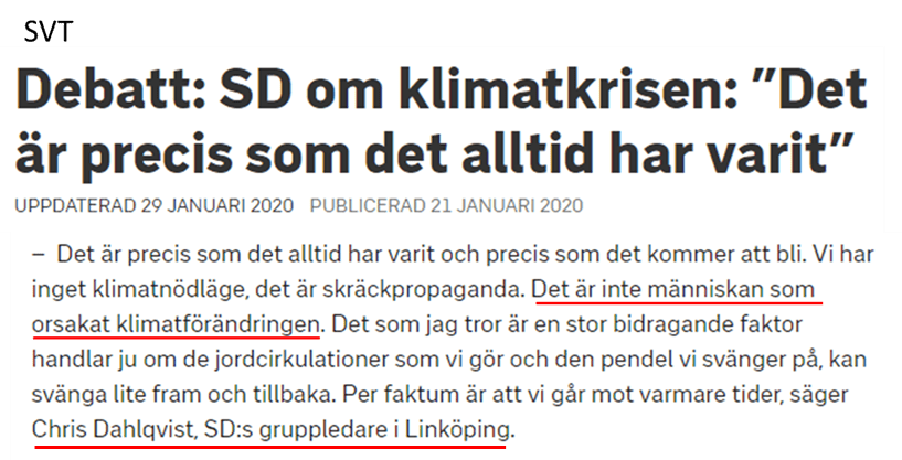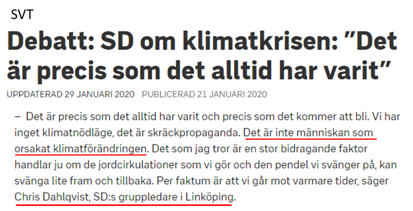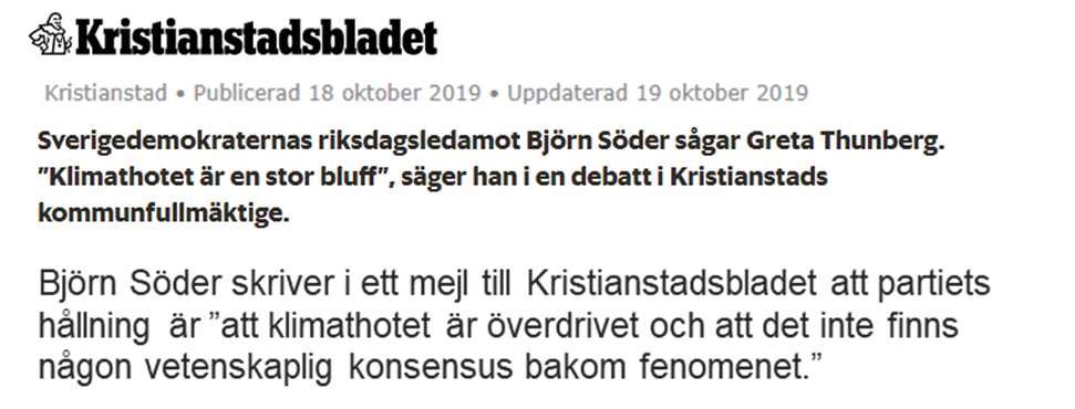Sverigedemokraterna fick en debattartikel publicerad i Aftonbladet här om dagen. SD ger C, MP och miljörörelsen skuldenför att ungdomar har klimatångest och pekar på en studie i Lancet.Visst görs det överdrifter (IPCC förutspår t ex inte jordens undergång) men jag är ärligt talat trött på att de som ägnat decennier åt att motarbeta åtgärder och förneka problemets existens nu skyller ifrån sig (för det var framförallt bristen på agerande som fick barnen att må dåligt). Var står Sverigedemokraterna i detta sammanhang, accepterar de IPCC:s slutsatser? Det är det minsta man kan begära att få utrett i klartext inför valet.För ja, det finns anledningar att tvivla.