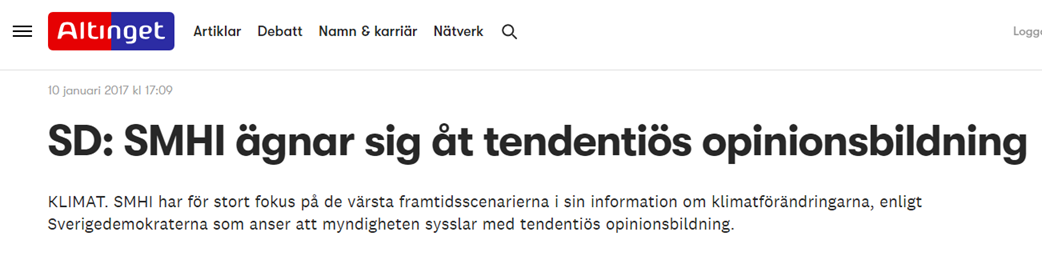 Och vi kanske inte ska glömma bort att SD var upprörda för att SMHI ägnade sig åt tendentiös opinionbildning, och därför drog ner deras anslag med 11 miljoner i sitt budgetförslag 2017.