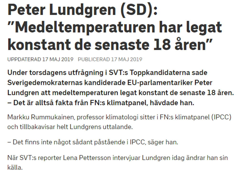 När SD:s EU-parlamentariker Peter Lundgren intervjuades i SVT inför EU-valet 2019 påstod han att det inte skett någon uppvärmning på 18 år: