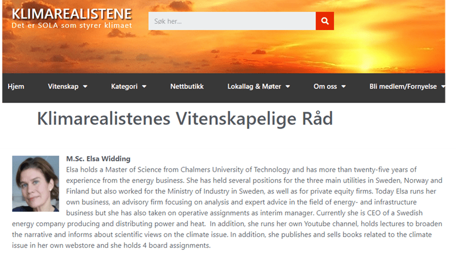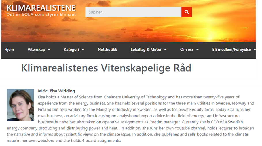Elsa Widding tog även plats i norska Klimatrealisternes ”vetenskapliga råd” – trots att hon aldrig sysslat med forskning. På deras faktasida står uttryckligen att ”Ekstra tilførsel av CO2 og metan (CH4) vil ha en ubetydelig virkning på drivhuseffekten, og virkningen på temperaturen lar seg ikke måle.”