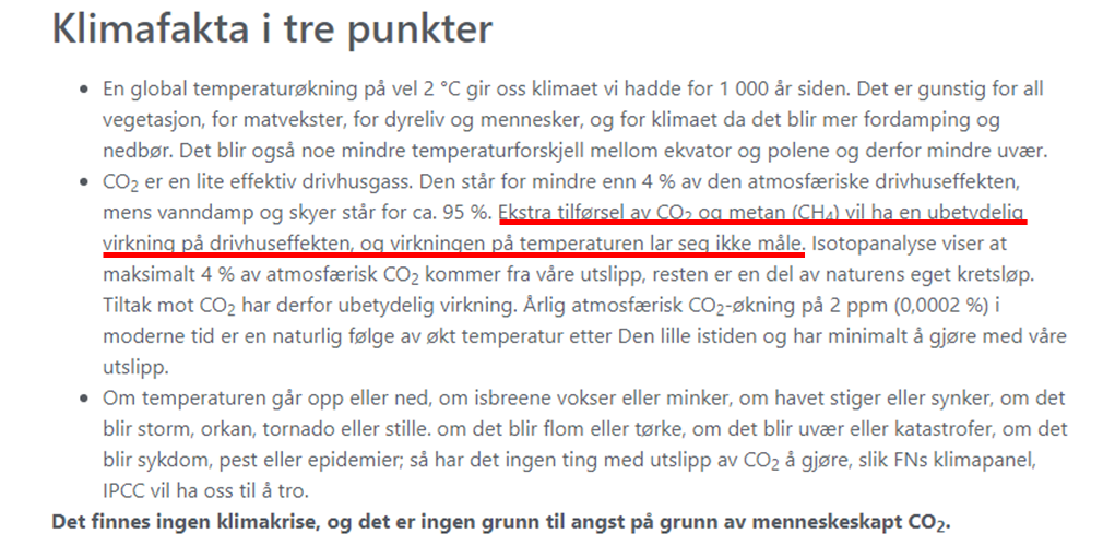 På deras faktasida kan man läsa att CO2-ökningen i atmosfären inte har med våra utsläpp att göra och påverkar inte alls klimatet i någon hög grad.
