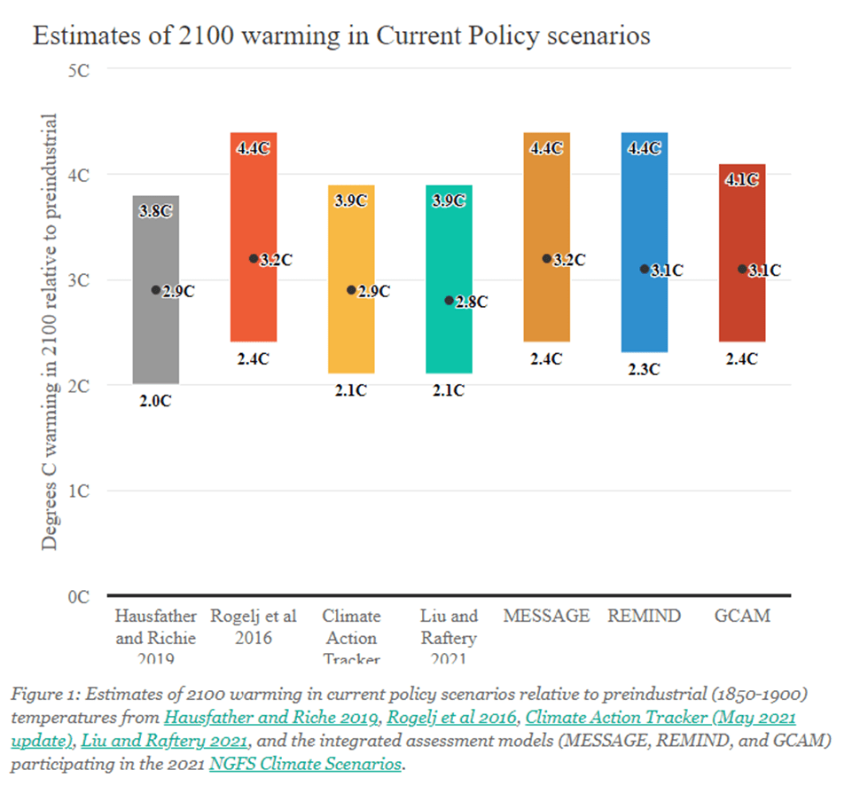 Bokens syfte sägs som sagt vara att peka ut osäkerheter men är extremt enkelriktad, ibland så att det gränsar till desinformation. Klimatmodellerna i senaste IPCC-rapporten fokuserar på fem tänkta scenarier baserat på olika framtida utsläppsnivåer. Widding anger att vi tycks följa ”mittenscenariot” SSP2-4,5 och: ”Detta scenario ser ut att kunna klara Parisavtalets 2-gradersmål med risk att hamna ett par tiondelar högre. Det finns en realistisk risk att man landar på 2,4 grader vid seklets slut.”
