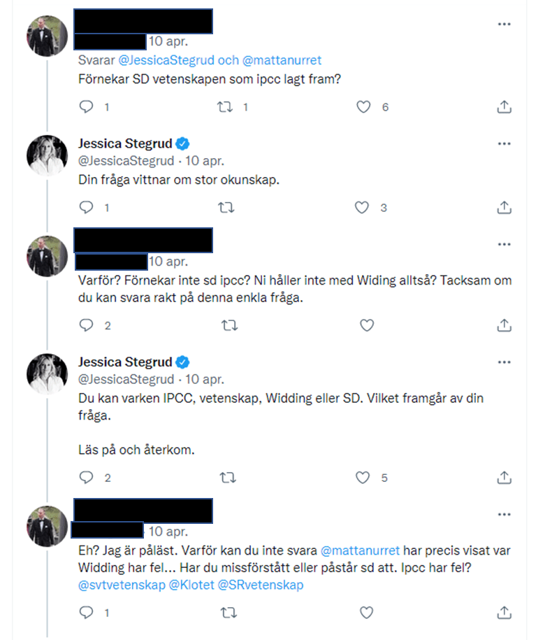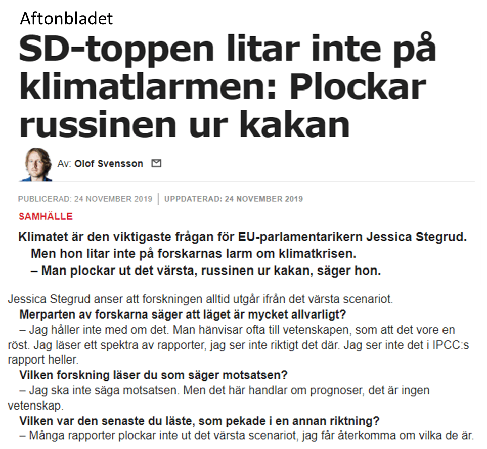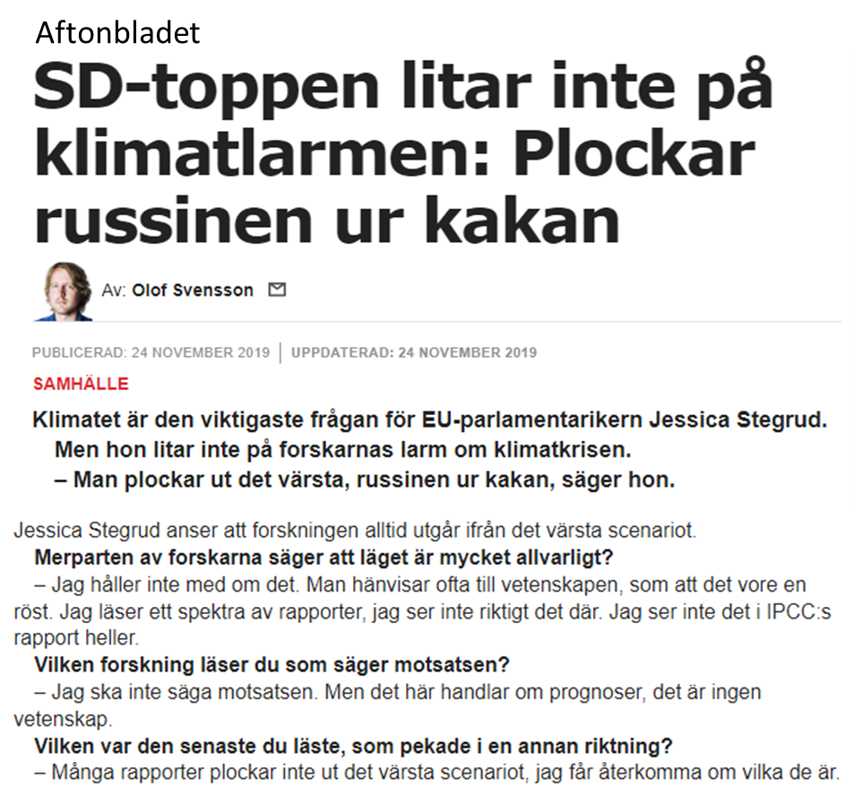 Inget riksdagsparti kommer förstås öppet säga att de inte accepterar klimatforskningen, men det går ju alltid att hävda att det finns andra forskare än IPCC … I en av mina trådar på Twitter, vägrade Jessica Stegrud, nuvarande EU-parlamentariker och nummer 8 på SD:s riksdagslista i kommande val, ge ett svar på om SD accepterade IPCC:s slutsatser (se klipp nedan – jag återkommer till det):