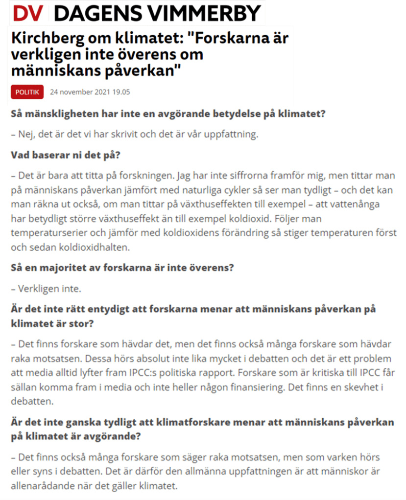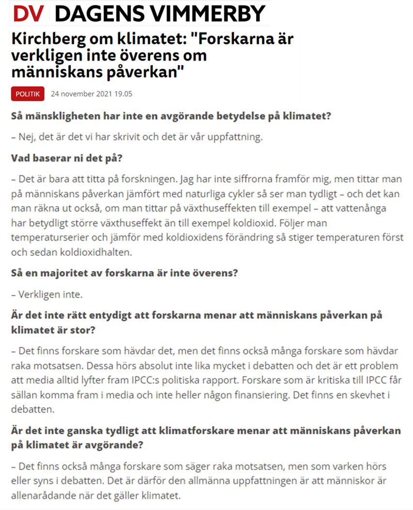 Och så där fortsätter det. Korrekt information blandas med faktafel, ensidig data och sen länge motbevisade myter. För den som inte är bevandrad i klimatdebatten blir det oerhört svårt att veta vad som stämmer. Därutöver ges åtskilliga beskrivningar av ett utmålat förtryck i stil med: ”…dagens stigmatisering av oliktänkande ger en stark association till 30-talet då Sverige tog initiativ till, och var världsledande, inom rasbiologi.”