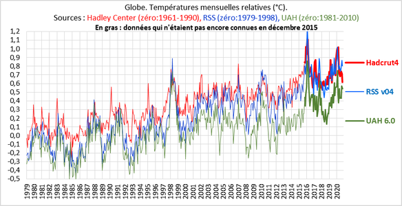 Toppnoteringen år 2016 var just under ett kraftigt El Niño-år. Det var helt förväntat att temperaturen skulle sjunka efter det. Även under 2020 rådde liknande förhållanden om än inte alls lika kraftigt, se nedan. Där kan vi också se att vi nu har varit inne i en La Niña-period med förväntad ”nedkylning”. Notera att trots detta var förra årets temperatur varmare än de flesta tidigare åren, även de med kraftig El Niño.