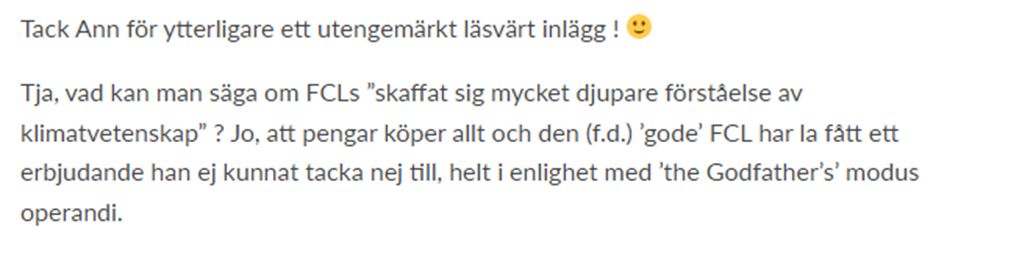 Det gick ett tag och plötsligt fick jag kommentarer om att jag var en falsk lögnhals. Det är inget ovanligt i och för sig, snarare en vardag för de som skriver om klimatet. (När mitt förlag Polaris fakta lade ut att min bok Spelet om klimatet skulle publiceras fick inlägget 800 kommentarer på Facebook.) Men oftast brukar kommentarerna komma som en reaktion på något jag skrivit eller gjort. Så inte denna gång.