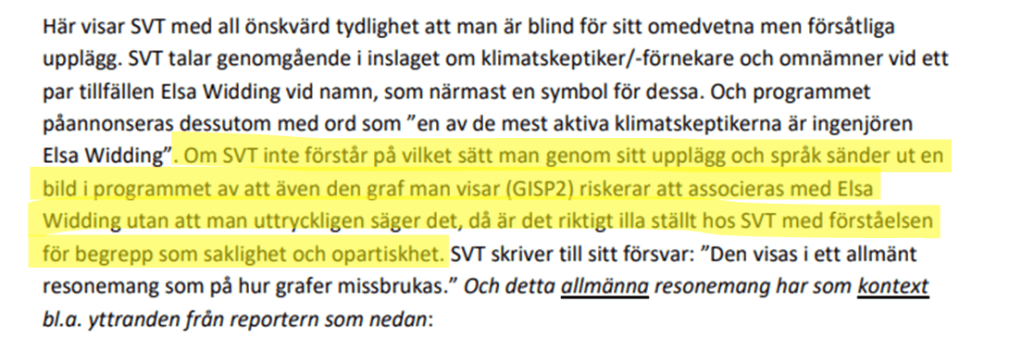 Min insats bestod i att kommentera en graf som frekvent används felaktigt i klimatdebatten. En temperaturrekonstruktion utifrån en isborrskärna från Grönlands glaciärer (se bild nedan). Ingen påstod i inslaget att Widding använt den men tragikomiskt är att hon ändå blev kränkt av att det kunde uppfattas så. Från anmälan: