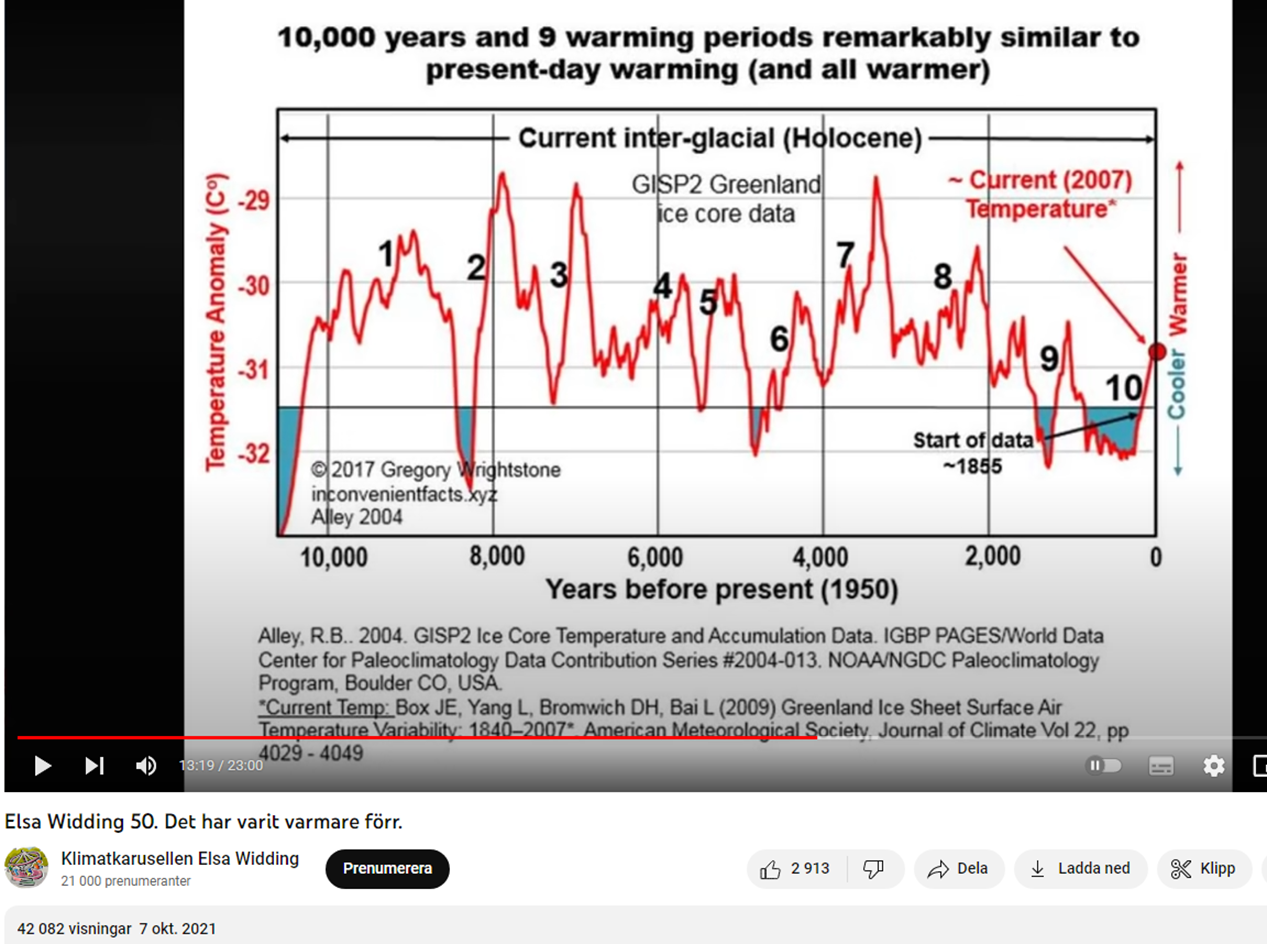 Jag har tidigare visat att hon använder samma graf på felaktigt sätt även efter Aktuelltinslaget. I sin video där hon ska ”klä av” SVT-reportern Erika Bjerström angående att det har varit varmare förr. Hon säger att det har ju Erika redan erkänt genom att hänvisa till GISP2-grafen. Återigen hävdar EW att det var 1,1C varmare ett par hundra år f Kr. än vad det är nu genom att peka på just GISP2-grafen, och att det är Erika som fuskat, se bilder nedan.
