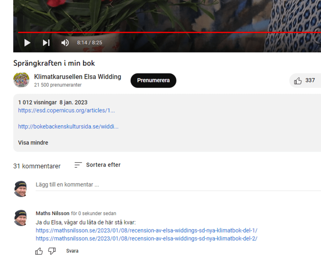 Elsa Widding bemötte recensionen i ett Youtubeinlägg och påstod att jag inte läst hennes bok. Hon lanserade till och med idén om att det istället kanske var SVT:s klimatkorrespondent Erika Bjerström som skrivit den. Hennes kollega Jessica Stegrud gav mig nedanstående kommentar på Twitter (som hon senare raderade):