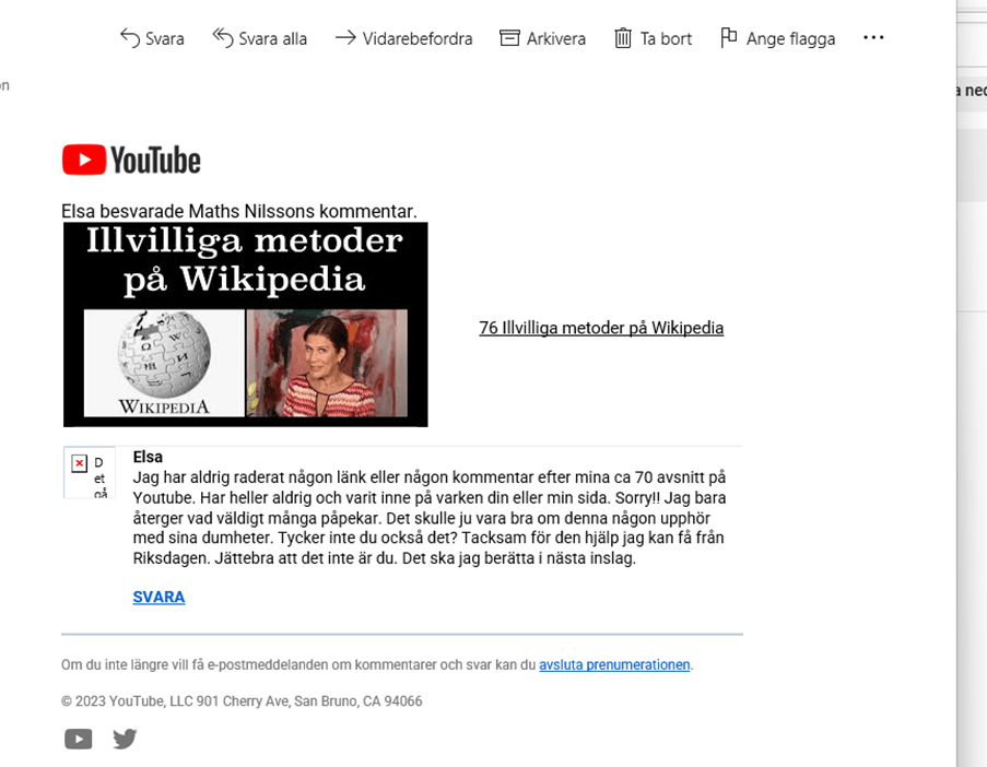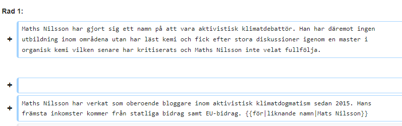 ”Vid en närmare studie av Maths Nilsson upptäcker man snart att han ägnar enorm tid åt att förfölja och även aktivt försöka stoppa människor från att framföra sina åsikter, även från att presentera sig själva. I förföljelsen sägs nämligen ingå att aktivt manipulera Wikipedias sidor. En känd journalist som studerat detta berättade för mig efter inslaget hur Nilsson manipulerar Elsa Widdings Wikipedia-sida.” […]