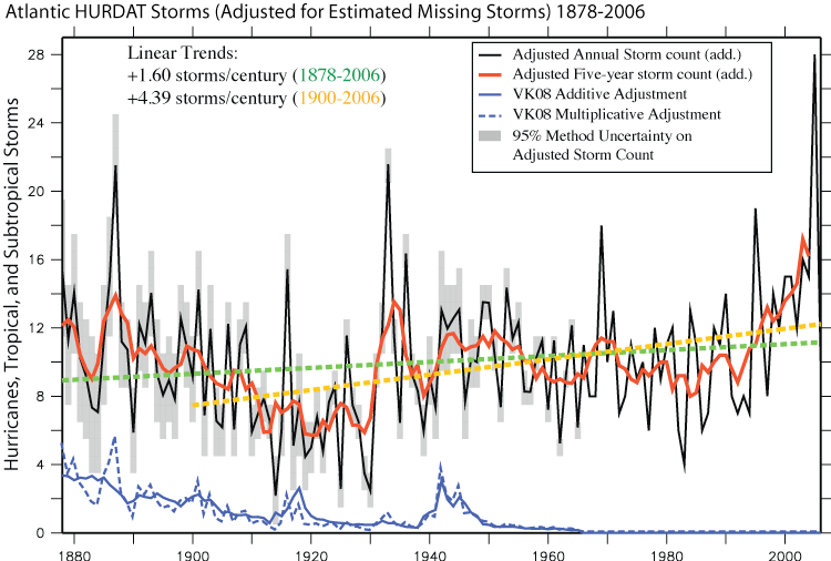 Men låt oss använda den översta grafen som är de data WMO använder sig av. Uppenbarligen finns det ingen ökning i det totala antalet här. Men ovan nämnda WMO-rapport säger att de har ökat med en faktor fem. Hur går det ihop?