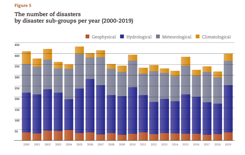 Där kan man också läsa att en del kan bero på bättre inrapportering men att det är en signifikant och reell ökning. Det står dock också att antal händelser per år har legat ganska konstant på denna sida milleniumskiftet. ”Overall, the number of disaster events per year and the distribution of disaster sub-groups has remained relatively stable between the year 2000 and 2019.”
