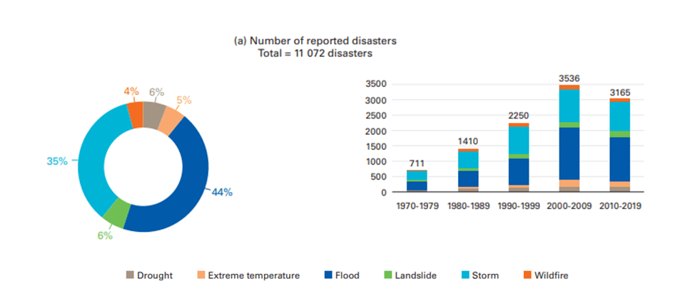 Jo, den beskriver utvecklingen över en 50-årsperiod: ”The number of disasters has increased by a factor of five over the 50-year period, driven by climate change, more extreme weather and improved reporting.”