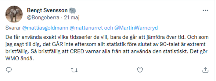 WMO har i sina rapporter hämtat data från databasen EM-DAT, som är världens mest kompletta källa för den här typen av data. Den drivs av The Centre for Research on the Epidemiology of Disasters (CRED) vars chef/professor är Debarati Guha-Sapir. Bengt har tydligen haft många mejlkontakter med henne och menar att hon bedyrar att det inte har skett någon ökning av naturkatastrofer och, som sagt, att man inte kan använda data som WMO gör.