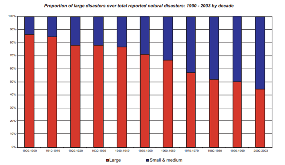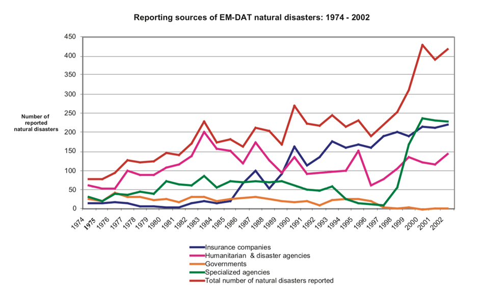 Office of US Foreign Disaster Assistance (OFDA) började aktivt samla data från år 1960 och CRED från 1973. De nämner att andelen inrapporterade händelser av mindre allvarlig karaktär kan indikera hur mycket bättre kvaliteten på statistiken har blivit: