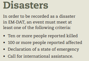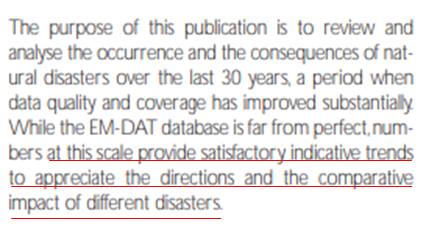 Den börjar med meningen: ”Today, the world is facing disasters on an unprecedented scale.” Men absolut rekommenderas att man hanterar uppgifter från deras databas varsamt och tänker på osäkerheterna. Det gäller förstås främst äldre data. Den synbara ökningen under senare decennier beror till stor del på en ökad inrapportering. Men från när är det så?