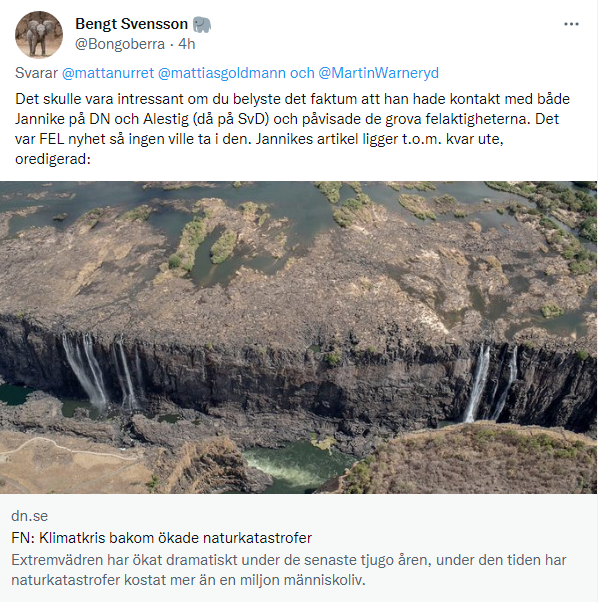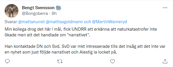 Jag blev också uppmanad att påvisa hur en artikel i DN fortfarande låg framme trots att Bengts kollega informerat journalisterna om att den var felaktig: deras uppgifter visade att det inte skett en ökning. Han hade till och med fått det bekräftat av chef på United Nations Office for Disaster Risk Reduction (UNDRR):