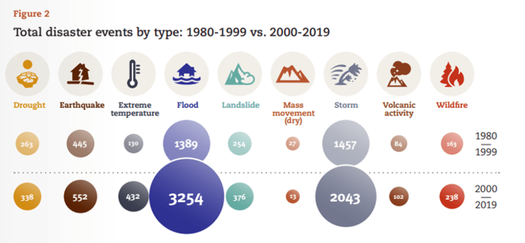 ”Globalt har 7.348 naturkatastrofer inträffat de senaste två decennierna, en dramatisk ökning jämfört med den föregående tjugoårsperioden då antalet var 4.212.”