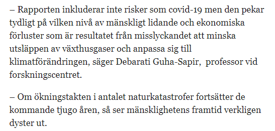 DN-artikeln FN: Klimatkris bakom ökade naturkatastrofer belyser en rapport från CRED och UNDRR (Guha-Sapir har skrivit förordet): ”The human cost of disasters: an overview of the last 20 years (2000-2019)”. Problematiken verkar vara lite av samma sort som i Lancetartikeln ovan. Ingressen börjar: