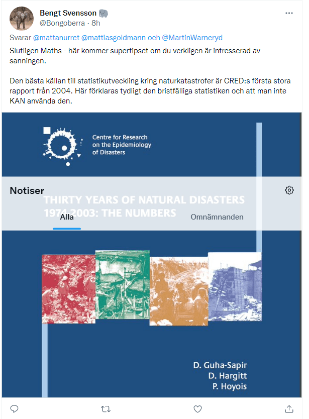 Jag får också en länk till ett inlägg av tidigare journalisten Anders Bolling som numera jobbar för lobbygruppen Näringslivets medieinstitut. Bolling har till och med intervjuat Guha-Sapir och i klartext fått bekräftat att nej, det finns ingen ökning.