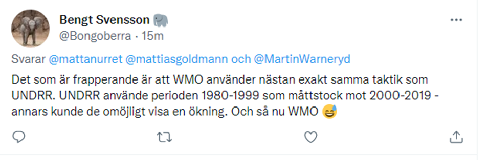 Jag blev indragen i en Twittertråd om huruvida naturkatastrofer blivit fler eller inte. Det apropå en rapport från WMO som jag inte hade läst: WMO Atlas of Mortality and Economic Losses from Weather, Climate and Water Extremes (1970–2019). Och när jag inte genast stod i givakt i min klimatjour och bemötte saken (orkade inte), så berodde det förstås på att jag tillhör klimatsekten som inte kan någonting: