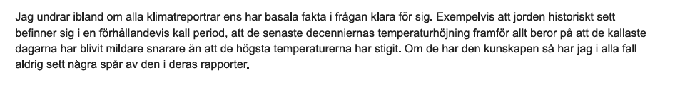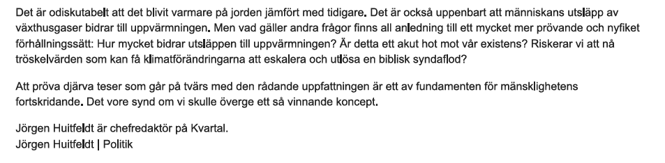 Med det sagt, extrema väderhändelser har använts felaktigt i debatten. Vilket t o m det påstått vänstervridna Sveriges radio har berättat om. Ja, Bolling beskyller i sin 100%-artikel FN-chefen Antonio Guterres för att ha larmat om att ”fallen av extremväder har ökat med fem gånger på 50 år” med en länk till just SR:s Kaliberprogram. Där får mycket riktigt FN skulden för dessa larm (utifrån en WMO-rapport), men det är nog inte FN som ska bära det största hundhuvudet i detta fallet. Något Bolling själv borde vara medveten om med tanke på en intervju han gjort … Läs mer: