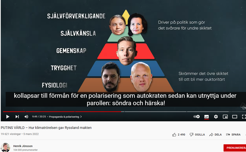 Libertarianska debattören (etiketten är satt av honom själv) Henrik Jönsson utvecklade det vidare i en Youtubevideo med rubriken: Hur klimatrörelsen gav Ryssland makten. Han inledde med att ställa frågan vilken roll klimatrörelsen har i konflikten mellan Ryssland och Ukraina. Han anförde sedan tesen att Greta Thunberg kanske är ett offer för rysk påverkansoperation med avsikt att söndra och polarisera västvärlden.