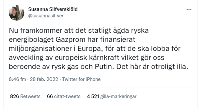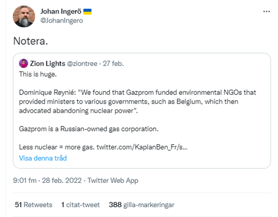”En aning bekymmersamt för den europeiska miljörörelsen när det nu avslöjas att vissa ”gröna” NGO:er som försett europeiska ministrar med underlag tagit finansiering av Gazprom för att påskynda nedläggningen av kärnkraften.”