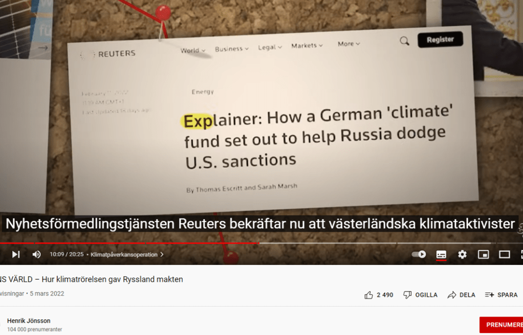 Henrik Jönsson säger i sin Youtubevideo Hur klimatrörelsen gav Ryssland makten, att Reuters nu bekräftat att ”västerländska klimataktivister spridit propaganda för att befrämja europeiskt beroende av rysk gas.” Han visade även rubriken från Reutersartikeln i fråga.