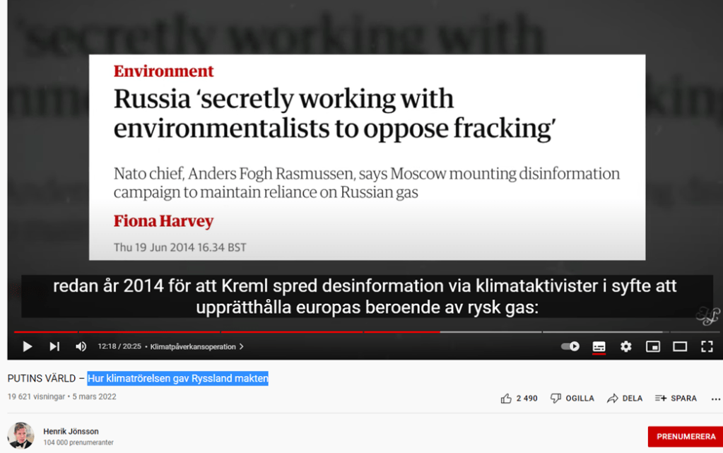 Jönsson (liksom flera andra) hänvisade till en åtta år gammal artikel i The Guardian (2014), där Natos före detta generalsekreterare Anders Fogh Rasmussen anklagade ryssarna för att ha underblåst motståndet mot fracking i Europa genom att finansiera miljöorganisationer.[12] (fracking innebär att man utvinner fossilgas genom att pumpa ner vatten under högt tryck i marken för att spränga sönder skiffersten).