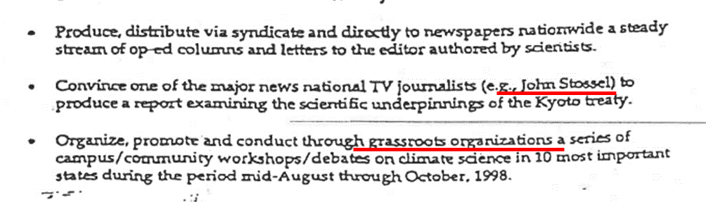 Richard Berman är ökänd i dessa sammanhang och har kallats The kingpin of astroturfing, det vill säga mästaren på att skapa fejkade gräsrotrörelser. Öknamnet Dr Evil fick han när han lanserade en kampanj emot Mammor emot rattfylleri. Han har vidare avslöjats ligga bakom minst fem sådana här frontgrupper som attackerat den amerikanska miljöskyddsmyndighetens regler för att minska koldioxiden från kraftverk.[24] Likaså har han via en annan tankesmedja, Employment Policies Institute, finansierat minst sexton rapporter från den konservativa tankesmedjan Beacon Hill. Enligt dessa rapporter skulle de nya reglerna för kraftverken leda till strömavbrott, få elpriserna att skjuta i höjden och förstöra lokala ekonomier. Chefen för Beacon Hill, David Tuerck har jobbat Heritage Foundation och American Enterprise Institute och har talat på Heartland Institutes klimatförvillarkonferenser.[25]