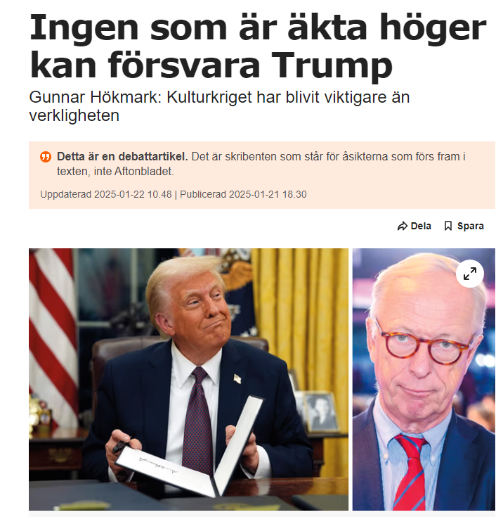 Gunnar Hökmark tar avstånd från Trump och menar att han inte representerar den riktiga högern. All heder för ditt inlägg, men, [för att travestera Nietzsche], är du säker på att Trump inte är avgrunden som stirrar tillbaka på dig?