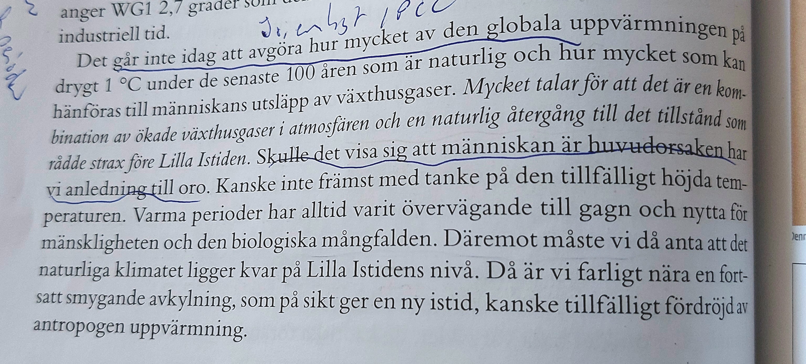 -sid 36 ”Sakkunniga tycks inte vara speciellt oroliga. [över klimatförändringarna]” (som kontrast mot hysteriska politiker)