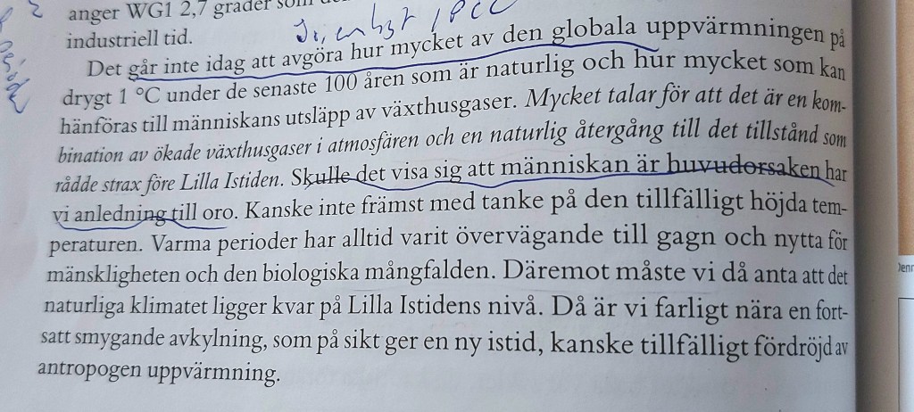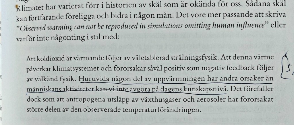 Widding påstår t ex att det inte går att avgöra hur mycket av uppvärmningen som beror på människan (det upprepades om och om igen, sid 17, 30, 32, 35, 64, 64, 71, 73 sen slutade jag räkna):