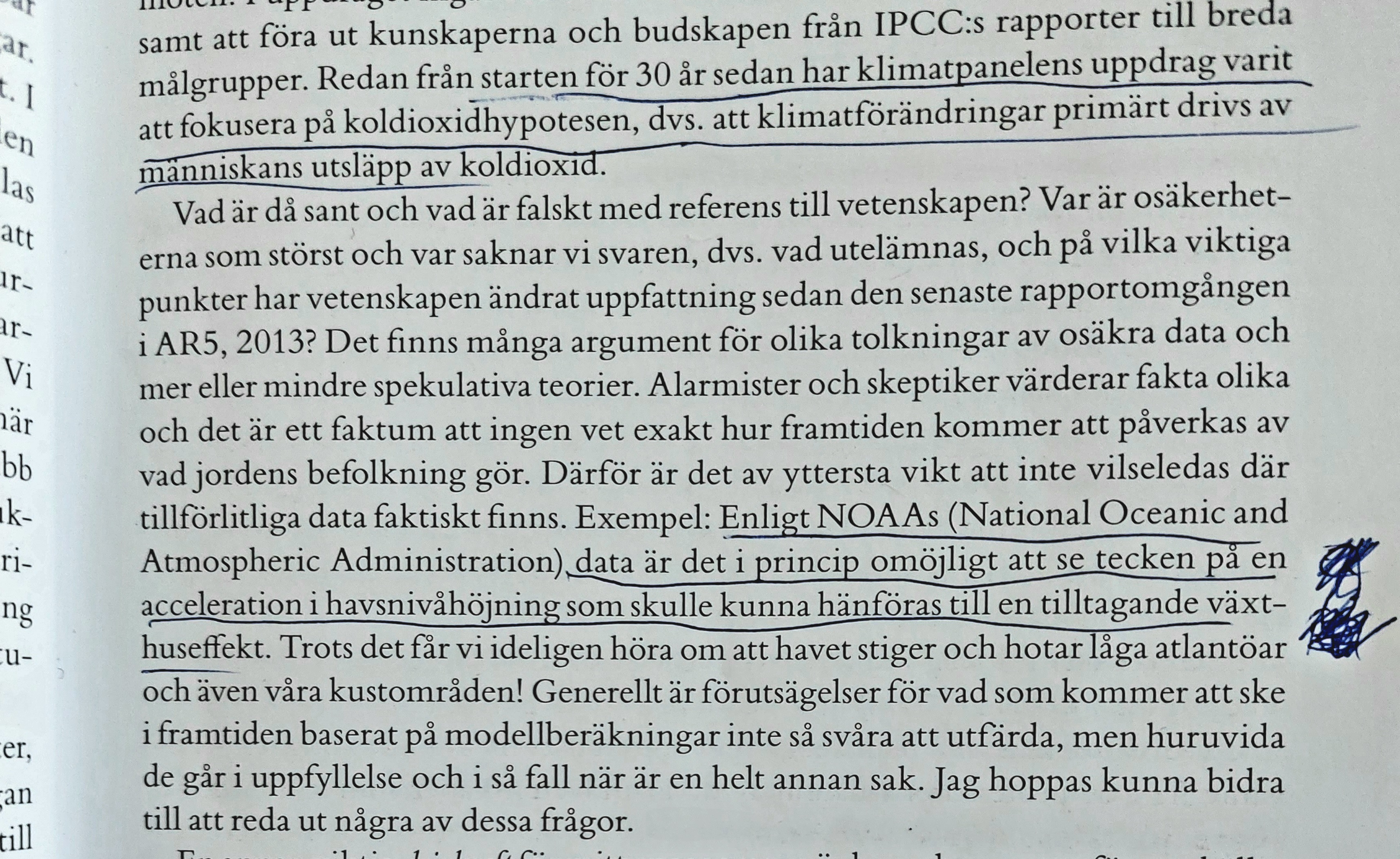 sid 15: ”Redan från starten för 30 år sedan har klimatpanelens uppdrag varit att fokusera på klimathypotesen, dvs, att klimatförändringarna primärt drivs av människans utsläpp av koldioxid.”