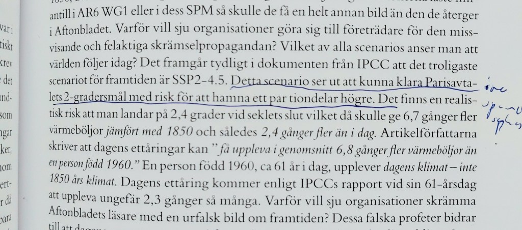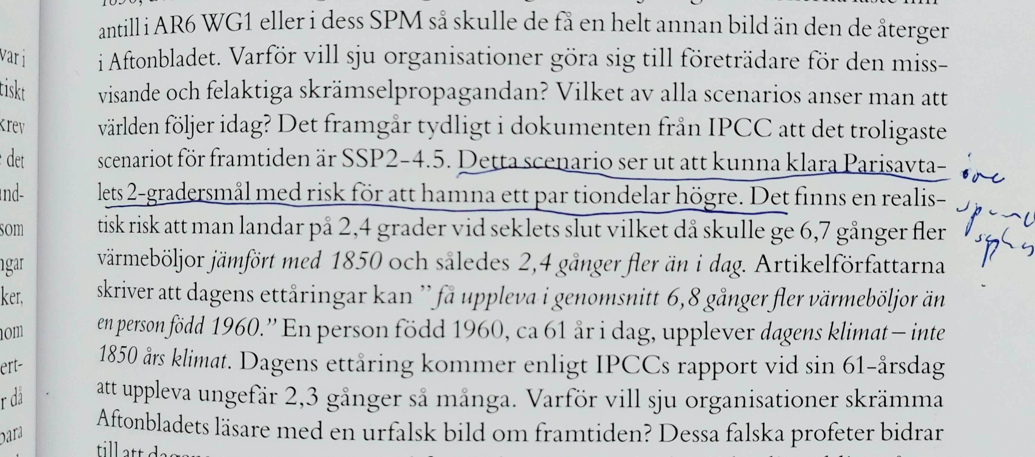 Min recension: Bokens syfte sägs som sagt vara att peka ut osäkerheter men är extremt enkelriktad, ibland så att det gränsar till desinformation. Klimatmodellerna i senaste IPCC-rapporten fokuserar på fem tänkta scenarier baserat på olika framtida utsläppsnivåer. . Widding anger att vi tycks följa ”mittenscenariot” SSP2-4,5 och: ”Detta scenario ser ut att kunna klara Parisavtalets 2-gradersmål med risk att hamna ett par tiondelar högre. Det finns en realistisk risk att man landar på 2,4 grader vid seklets slut.”