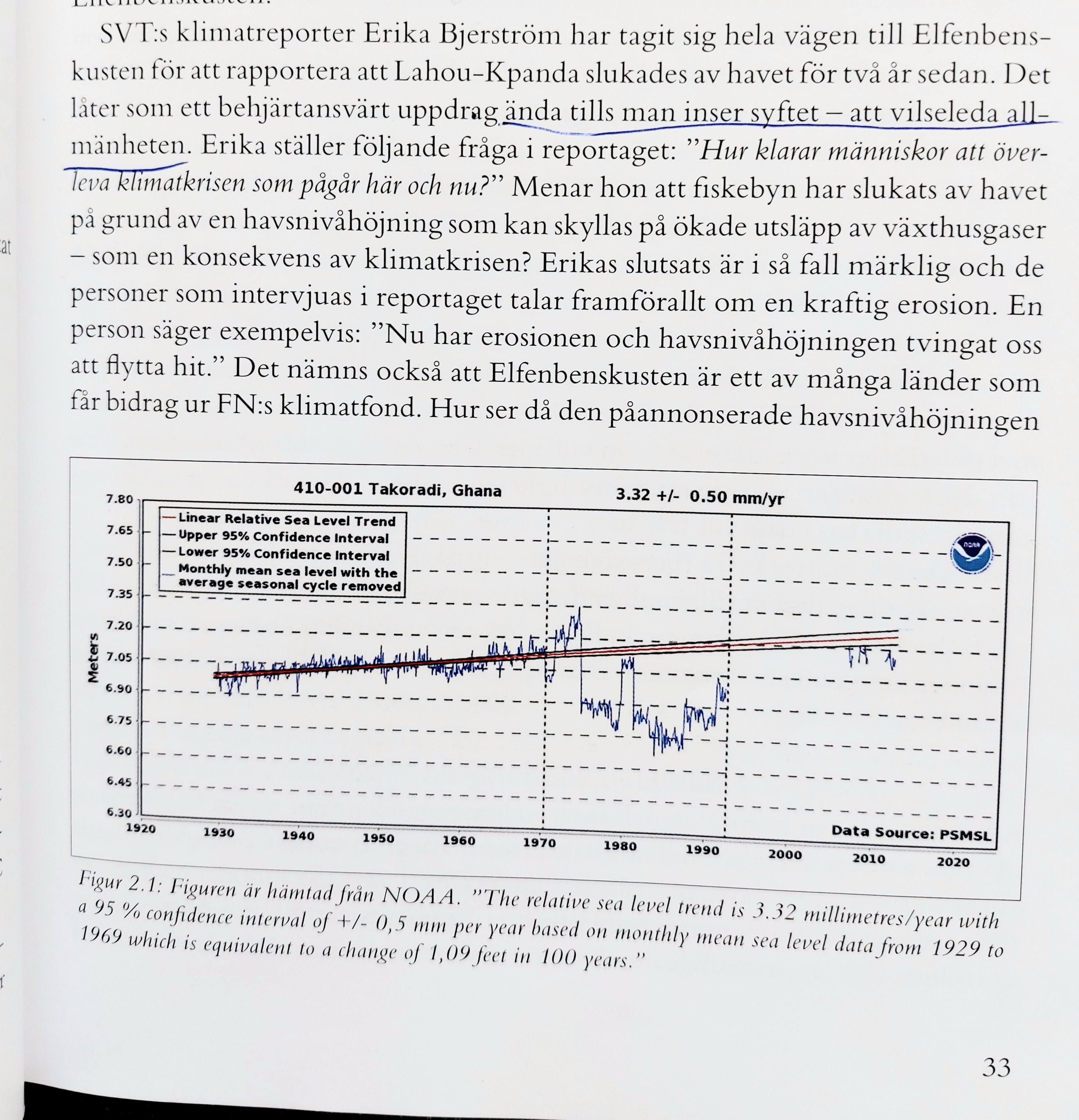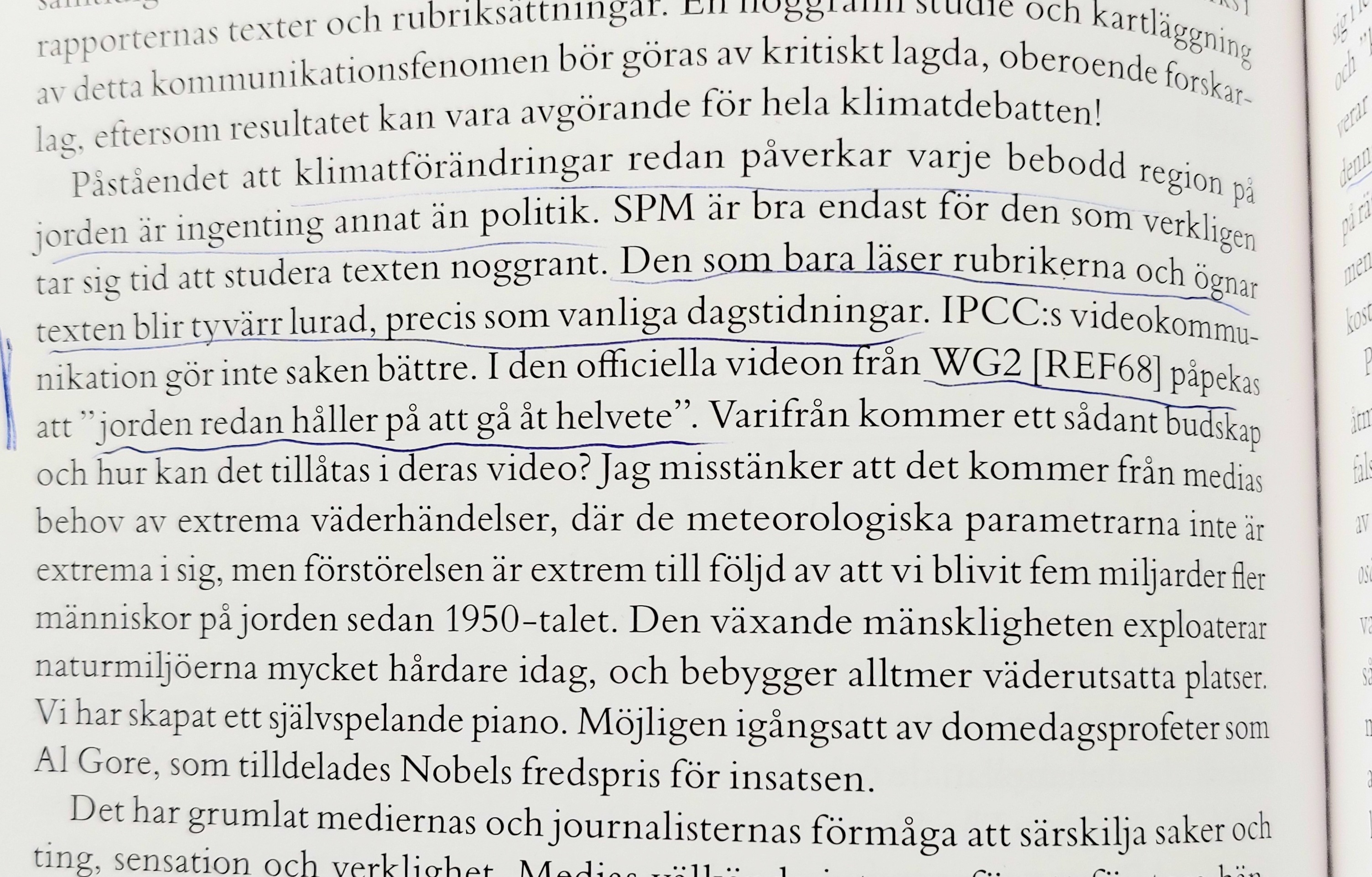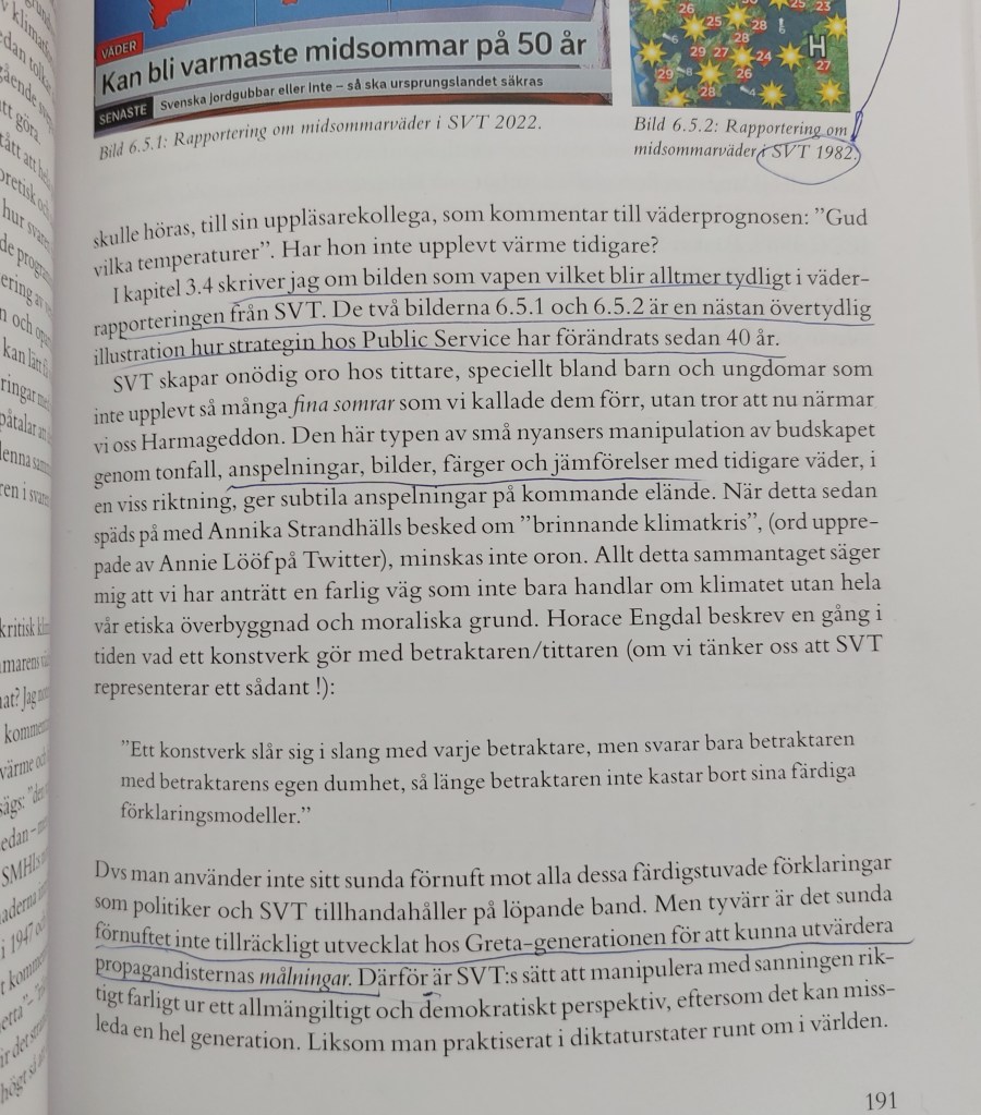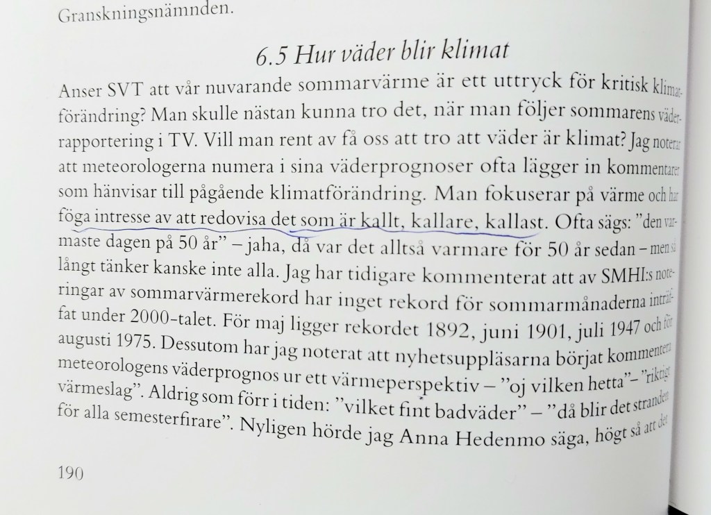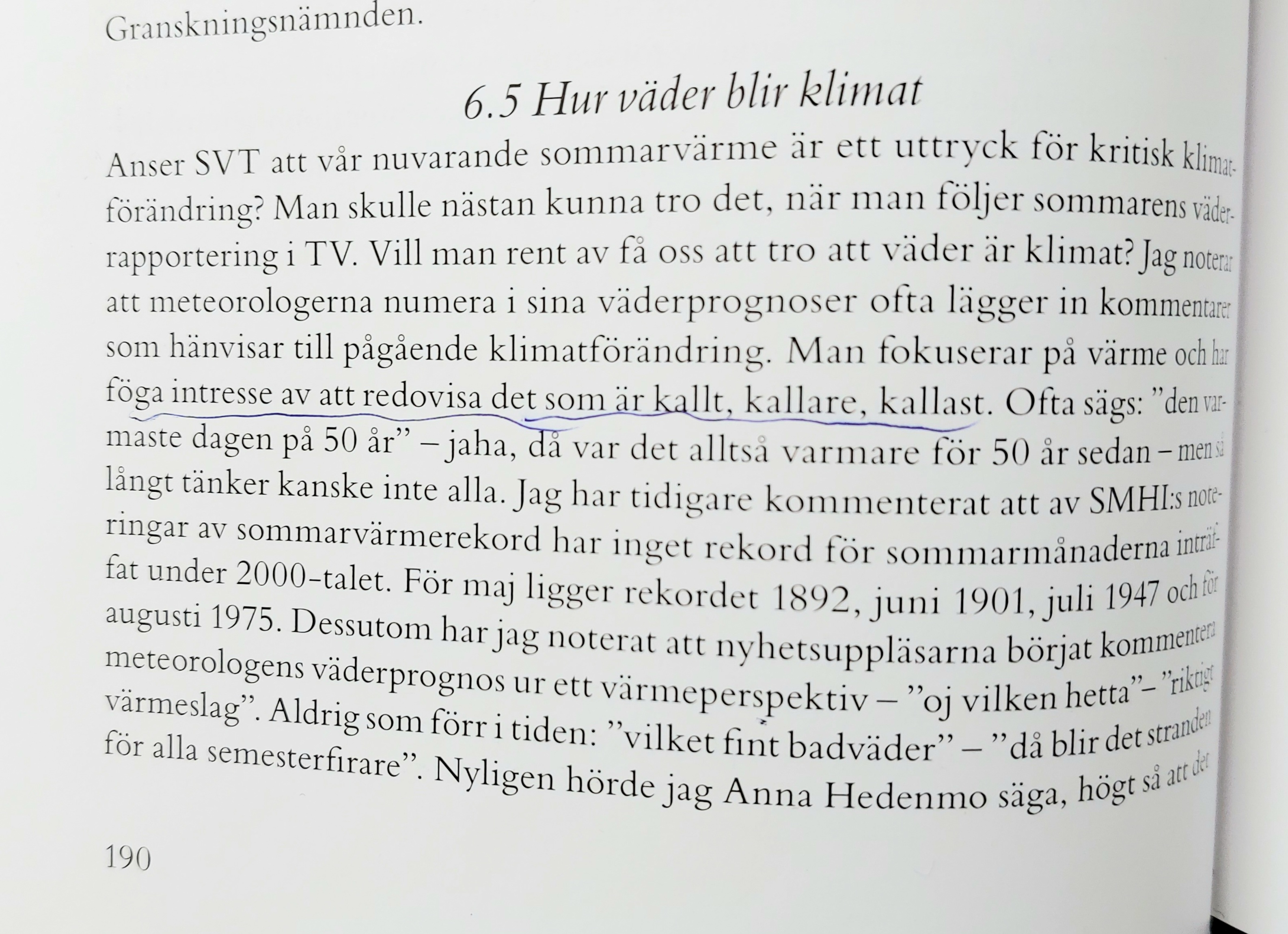 -sid 44: ”Public Service är ovetenskaplig i sin klimatrapportering och väljer att föra fram sina egna åsikter istället för att redogöra för vetenskapen. Syftet tycks vara att skrämma allmänheten.”