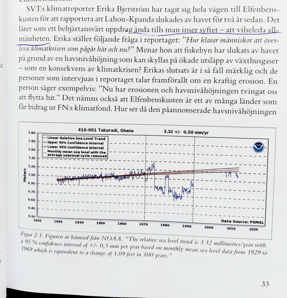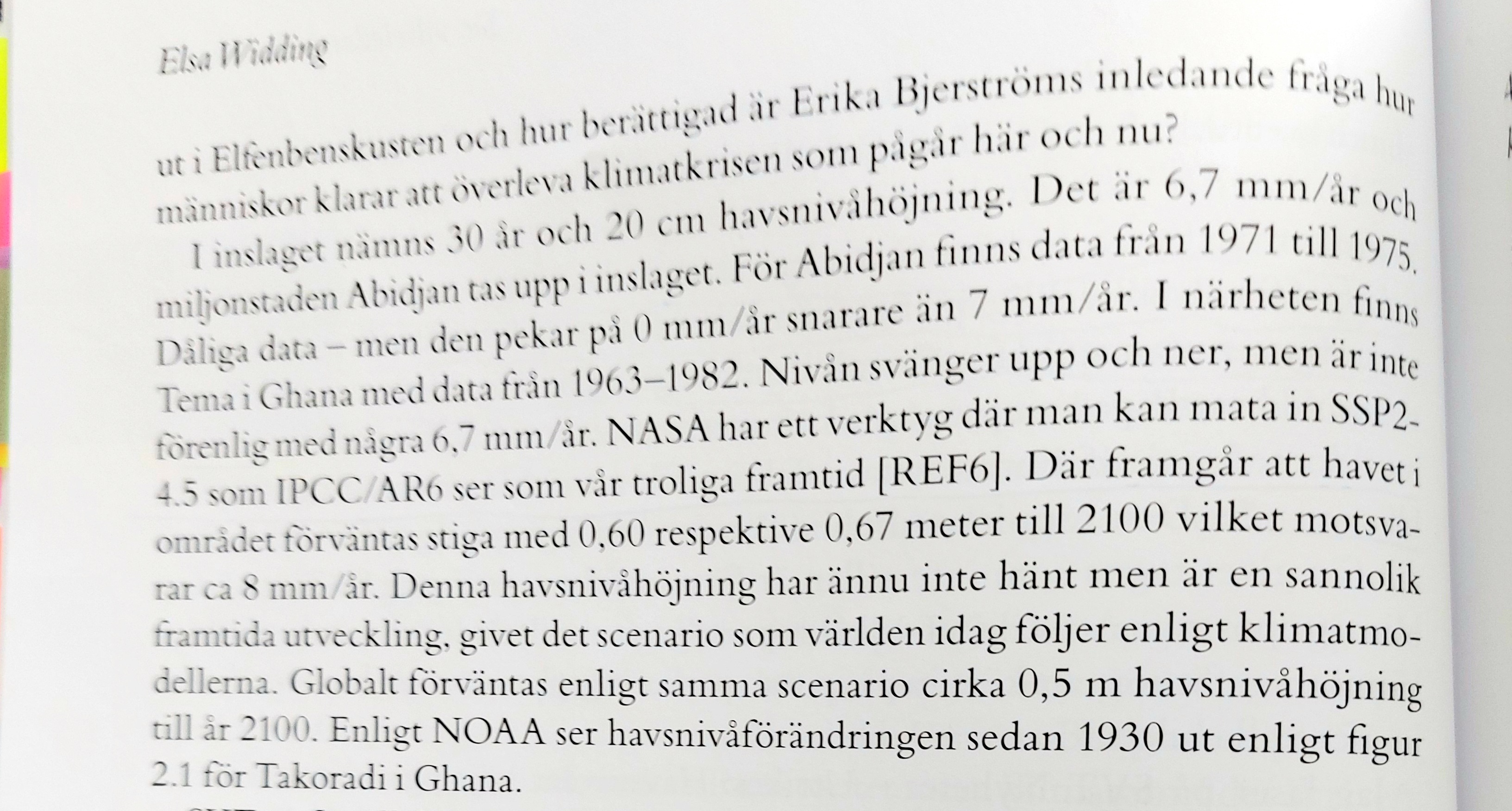 sid 108 EW kritiserar bl a SMHI för att använda IPCC:s värstascenario (RCP8.5/SSP5-8.5) – som nu anses vara rätt osannolikt, om än inte omöjligt – vid beräkningar av framtida havsnivåer. Hon slår på sid 109 fast att ”Någon havsnivåhöjning är däremot inte aktuell!”