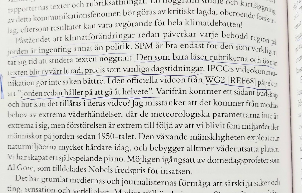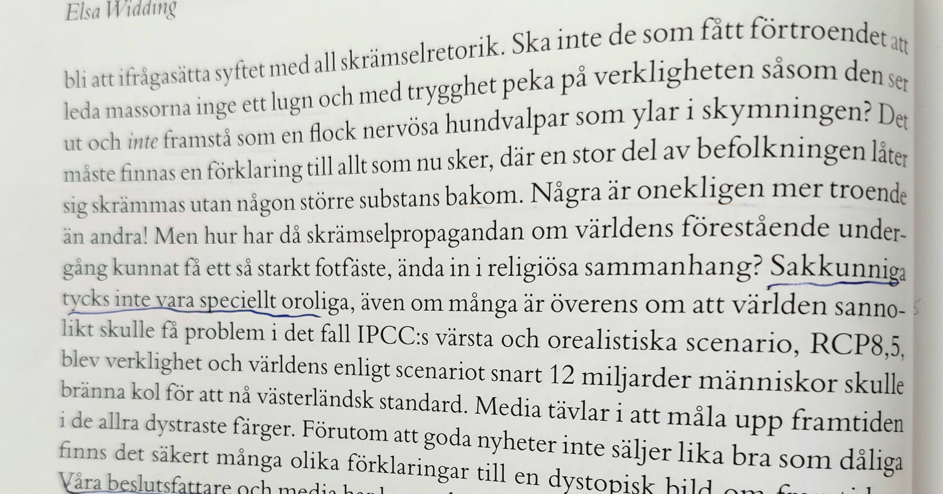 En del av mig tycker att boken kanske inte skulle uppmärksammas mer än nödvändigt, men nu sitter Elsa Widding i riksdagen och representerar Sveriges näst största parti och hon har inflytande på deras politik (hennes inställning i klimatfrågan var naturligtvis anledningen till att SD:s ledning satte henne högt upp på sin riksdagslista inför valet). Boken har dessutom redan använts av några av hennes kollegor som ett slags bevis för att EW:s uttalanden är förenliga med IPCC:s slutsatser. Men det är helt enkelt inte sant.