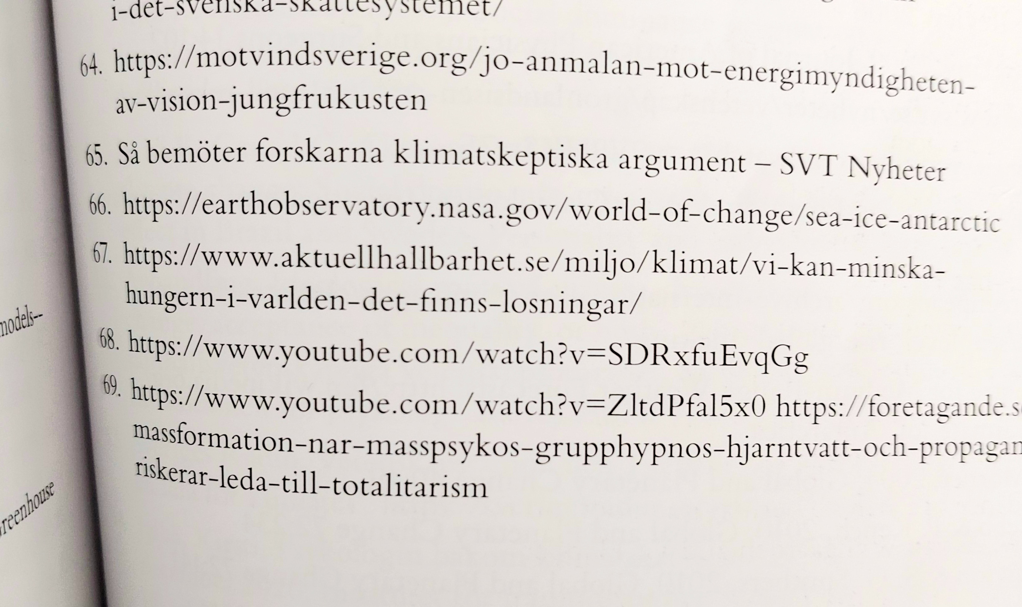–sid 68: [Om SOM-institutets opinionsundersökningar samt Chalmers forskning om klimatförnekelse]: ”…dagens stigmatisering av oliktänkande ger en stark association till 30-talet då Sverige tog initiativ till, och var världsledande, inom rasbiologi. […] Det känns nästan som om vi i Sverige är på väg mot ett upplyst tvångsvälde där endast rätt åsikter får förekomma.”