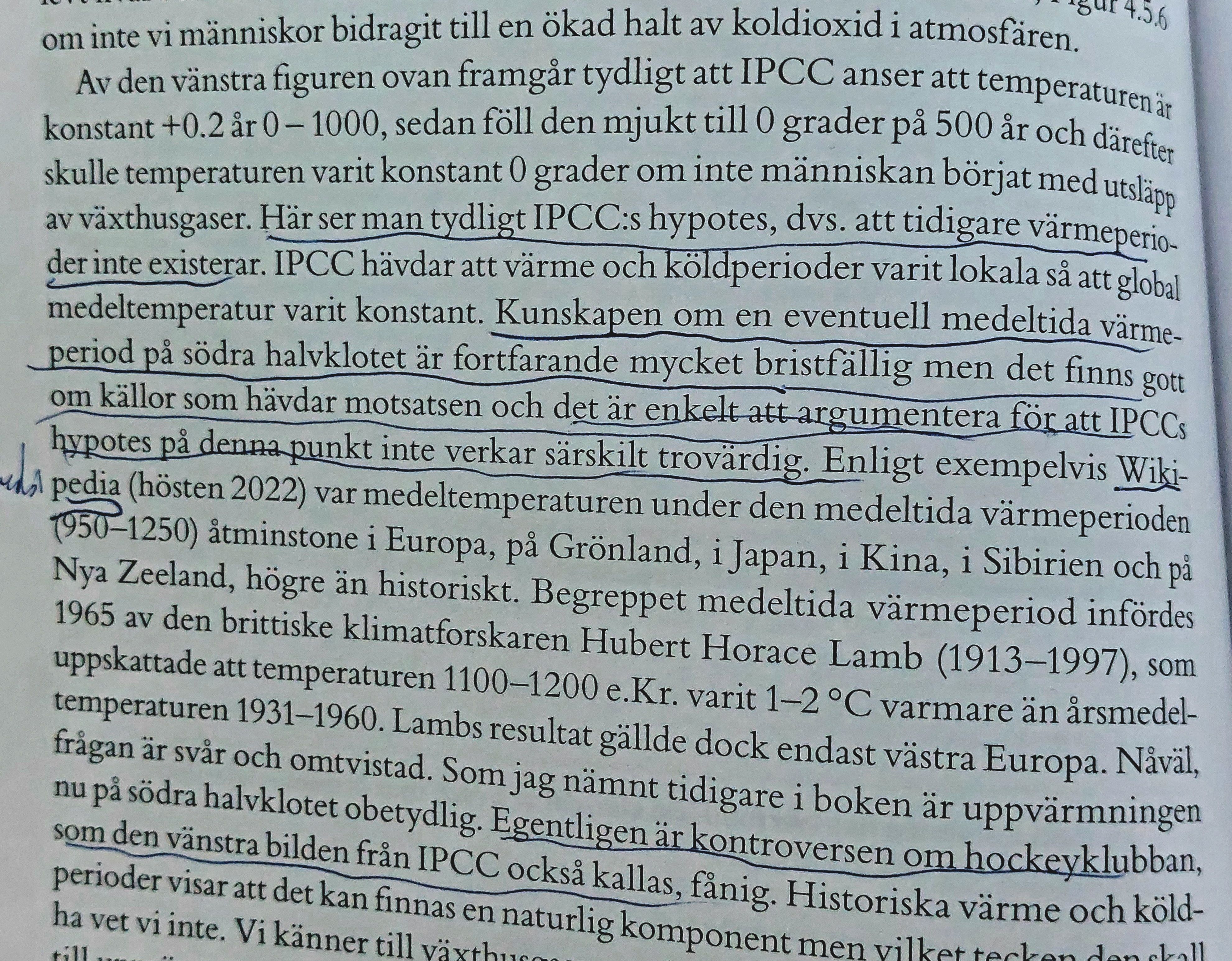 I sin bok uppger heller inte EW vilka uppgifter hon stöder ovanstående påstående på om att bl a medeltida värmeperioden skulle varit varmare än nu (definitivt inte IPCC som hon säger sig acceptera…). Det finns en hel uppsjö studier som motbevisar detta.