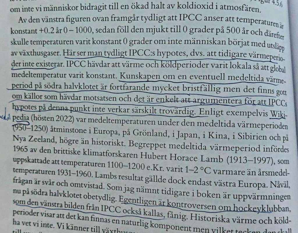 sid 119: ”… romartiden och medeltiden var lika varm eller varmare [än nu],trots lägre koldioxidhalt.”