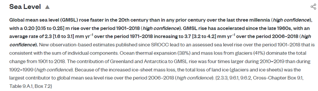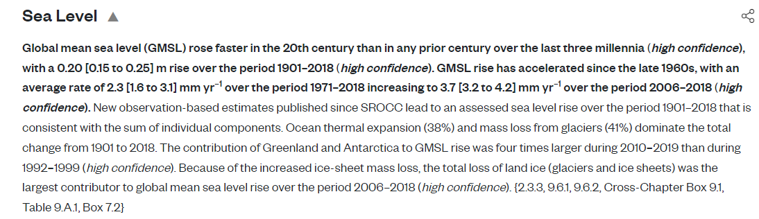 IPCC AR6 WG1:Global mean sea level (GMSL) is rising, and the rate of GMSL rise since the 20th century is faster than over any preceding century in at least the last three millennia (high confidence). Since 1901, GMSL has risen by 0.20 [0.15 to 0.25] m, and the rate of rise is accelerating.