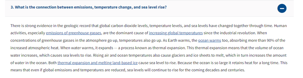 ”Observational data from tide gauges and satellites also show that sea level rise, both globally and along the continental U.S., is accelerating, with more than a third of that rise having occurred in the past two and a half decades (see NOAA and NASA portals for altimeter-based global rates and NOAA for local tide gauge rates).”