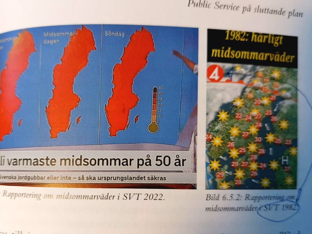 Sid 84: ”Att Public Service vidhåller att det aldrig varit varmare än nu är svårbegripligt, ‘Redan nu är det varmare än det varit på 100 000 år. Värmen gör att isar och glaciärer smälter allt fortare’, säger man till exempel 19 augusti 2021. Vi vet med stor säkerhet att det för 7000 år sedan var minst lika varmt som idag här i Norden och ännu varmare på Grönland. […] vi kan anta att det var lika varmt i Sverige som på Grönland. Det är ingen långsökt gissning att hela norra hemisfären var varm [REF 23]”