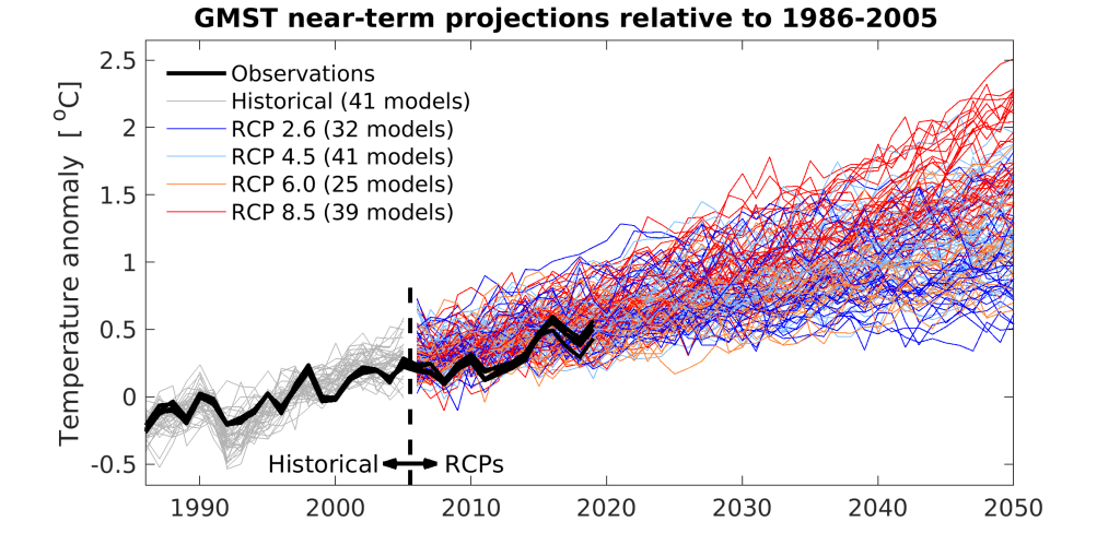 Bilden är från Climate Lab Book och visar alla olika utsläppscenerier (RCP:s). [är en annan bild, visar både CMIP5 och några av CMIP6 dvs de modeller som användes i IPCC femte (2013) respektive sjätte rapport (nästa år)]: