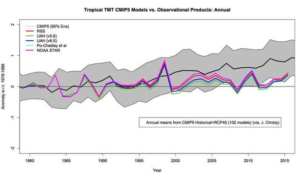 Notera också att det står Tropical Mid Troposphere. Det är alltså enbart från tropikerna och det handlar om mätningar från troposfären – nedre delen av atmosfären. Förhållandena i tropikerna skiljer sig från övriga jorden och troposfären är exempelvis betydligt högre där. Man har också haft svårt att få fram tillförlitliga mätdata från atmosfären därifrån. Att modellerna därför ligger en aning högre än observerat är inget som mörkas, men det är inte på den nivån som beskrivs i bilden ovan. Om man låter bli att körsbärsplocka data ser det mer ut så här (Gavin Schmidt, NASA, Real Climate):